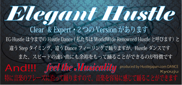 "Elegant Hustleは HustleJapan Danceがプロモート&展開推奨している独自のHustleダンスとなります。既存のHustle( &, 1,2,3,)カウントでなく、 Elegant Hustleカウント( &,1,2,Slow3-4,)を使用します。それが故に、Hustle初心者~経験者まで幅広くHustleを簡単に、そして早いスピードの音でも容易に楽しめます